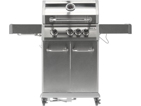 Grill gazowy Yato Itami 3+1 o nowoczesnej stylistyce wykonany ze stali nierdzewnej, wyposażony w żeliwny ruszt o powierzchni 60 x 41,5 cm. Półki boczne oraz pojemna, zamykana szafka ułatwiają przechowywanie niezbędnych akcesoriów. Palnik boczny o mocy 2,2 kW umożliwi gotowanie i podgrzewanie potraw w garnku lub na patelni. Dodatkowym atutem jest miejsce na butlę gazową, pojemnik ze stali nierdzewnej umieszczony w jednej z półek bocznych oraz wbudowany otwieracz do butelek.